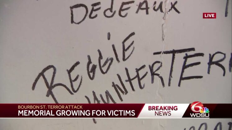 As a memorial continues to grow on Bourbon Street for the victims killed in the New Year’s Day terror attack, residents from all over New Orleans have paid their tributes. New Orleans sister station WDSU was there as an emotional scene unfolded at the site where the victims died. Residents were seen writing the names of those killed on a building wall. “Reggie…Matthew…Nikyra…”As a street musician played “The Star-Spangled Banner,” people, one by one, took Sharpies to the walls of the historic French Quarter, writing the known names of the victims killed in the New Year’s Day attack.A friend of one of the victims, Matthew Tenedorio, was visibly shaken as he wrote a message on the wall. “You didn’t win, terror,” he said, choking back tears. “You just made us stronger. Matthew was a friend. We will never forget this. Never.”Other messages written on the wall read “We will never forget,” and “We will honor you.”