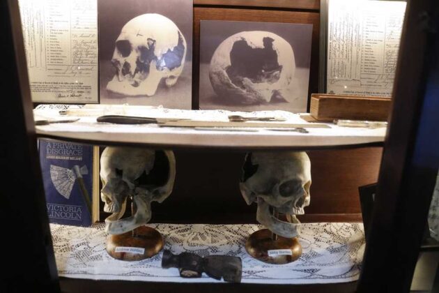 “I believe Lizzie did this,” tour guide Richard Sheridan tells a group of spellbound tourists as he shows them a mannequin on a bedroom floor spattered in fake blood, placed there to represent Borden’s slain stepmother.