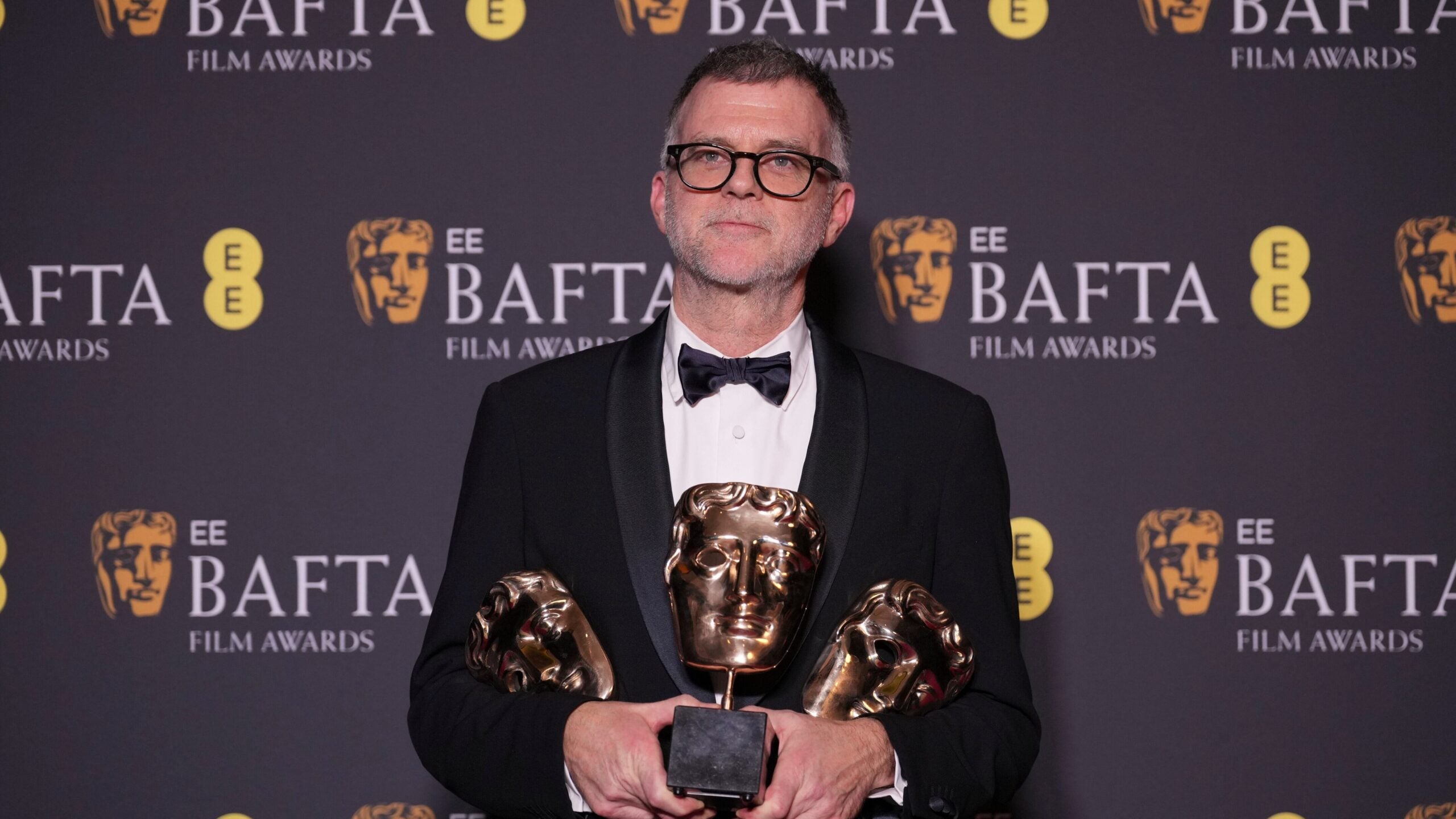 Paul Thomas Anderson poses with the awards for best director, cinematography, and adapted screenplay for “One Battle After Another” at the 79th British Academy Film Awards in London, Sunday, Feb. 22, 2026.
