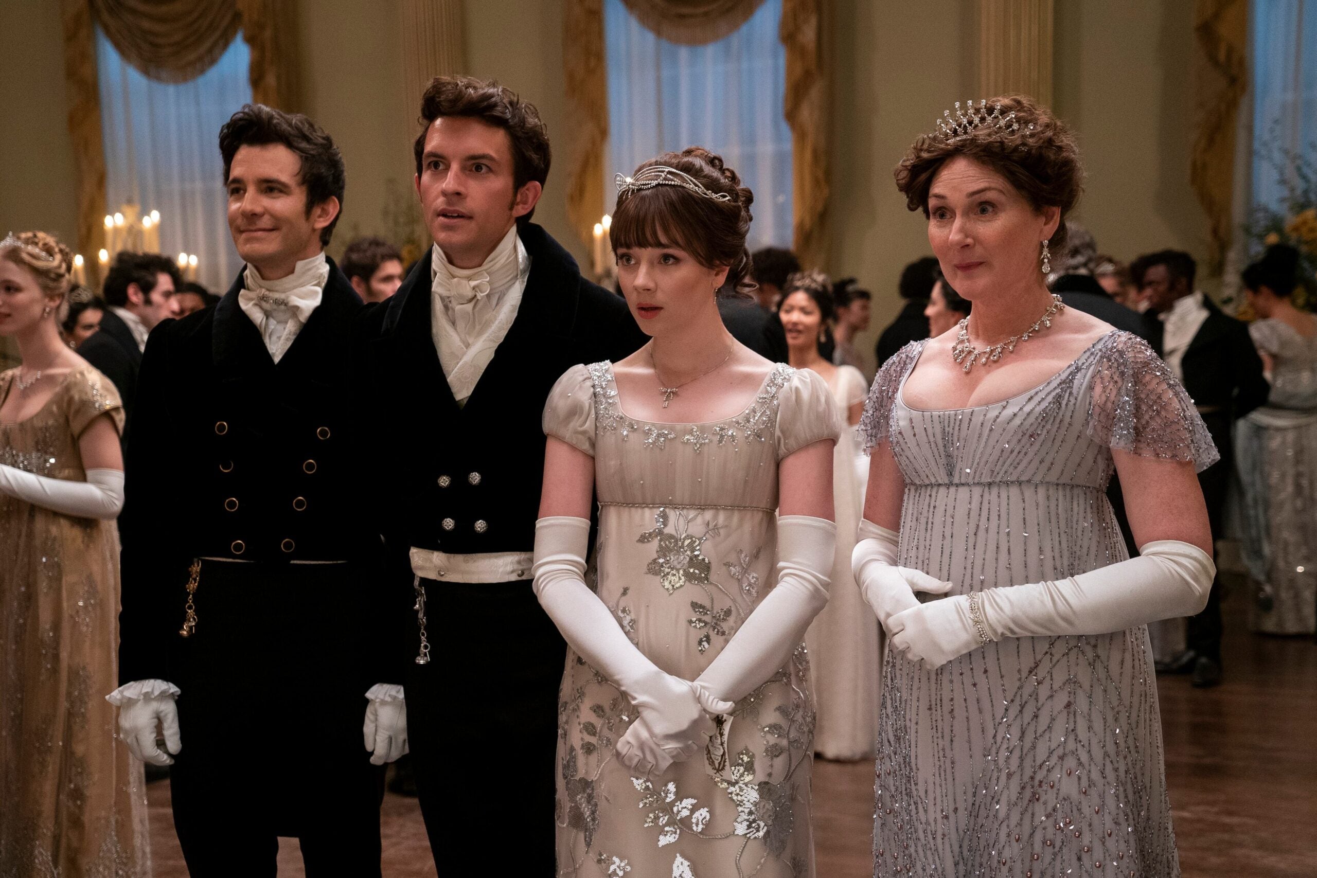 From left, Luke Thompson as Benedict Bridgerton, Jonathan Bailey as Anthony Bridgerton, Claudia Jessie as Eloise Bridgerton, Ruth Gemmell as Lady Violet Bridgerton in “Bridgerton.” – Liam Daniel/Netflix