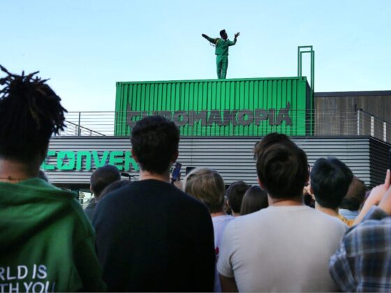 Tyler, The Creator performed on the shoe store’s roof atop a green shipping container with the name of his album, “Chromakopia,” across the side in black lettering. He wore an all-green outfit and a mask that he removed while singing, “Take Your Mask Off.”